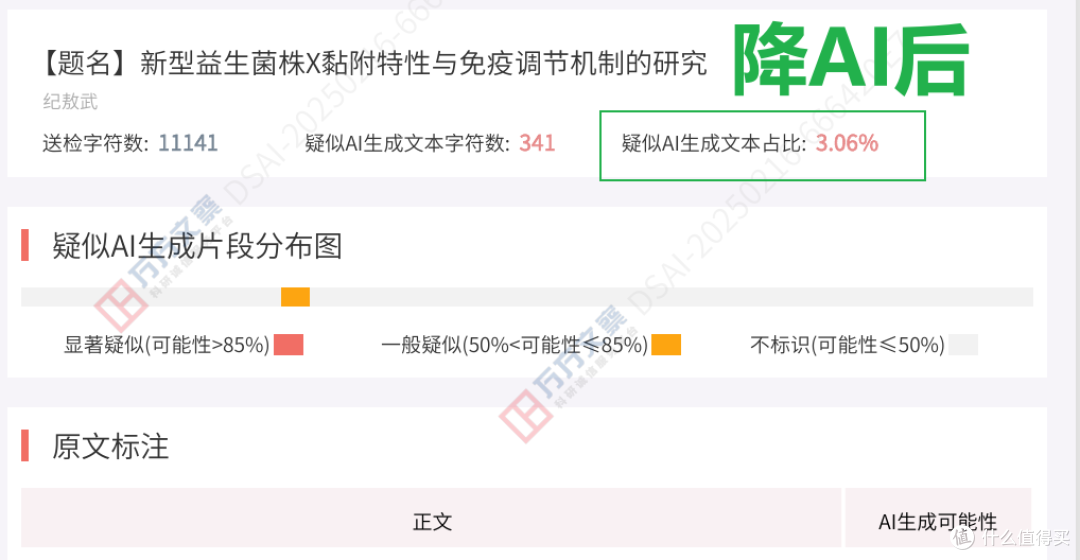 原始AI率:万方检测45.6% → 处理后AI率:3.06%